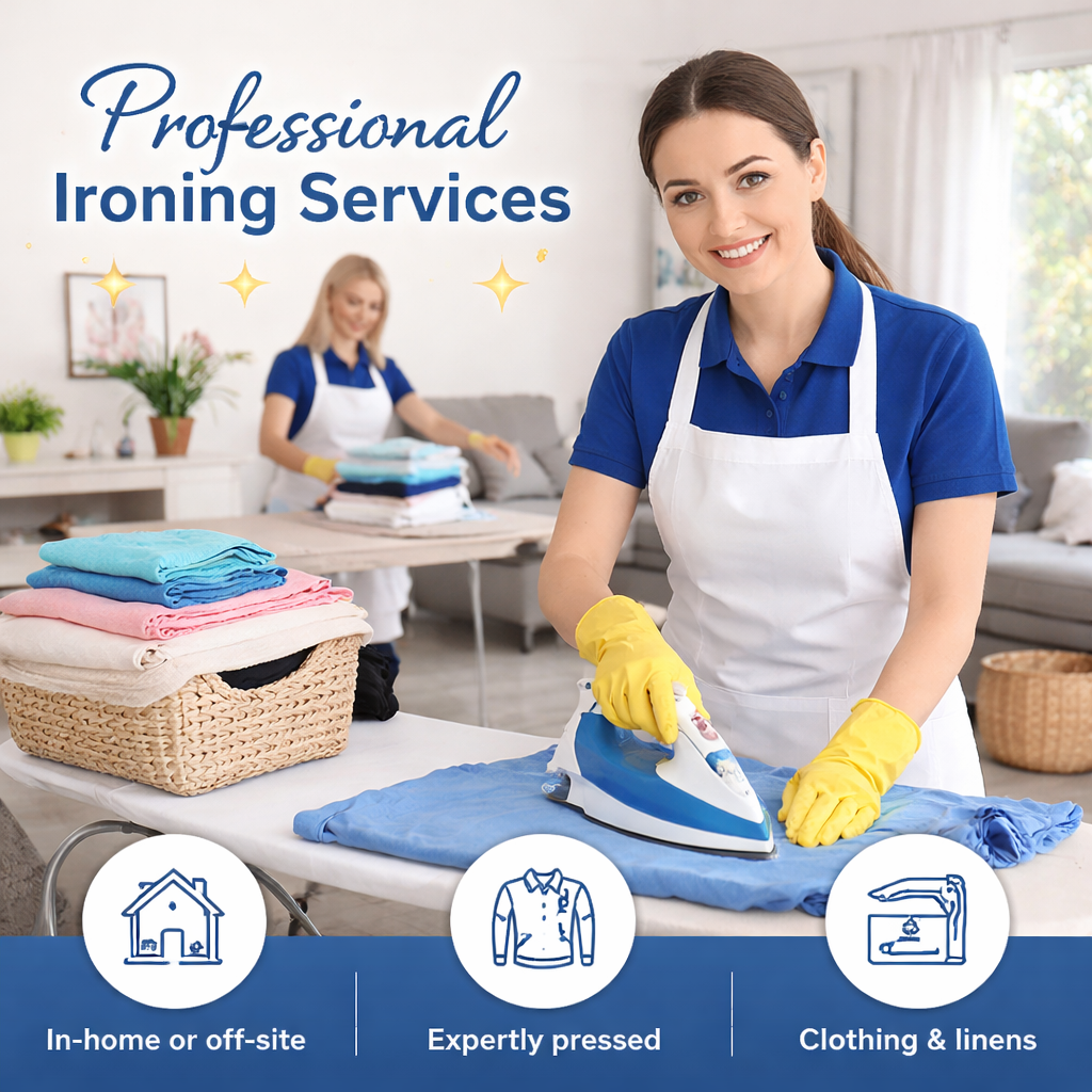 We can take care of your ironing right in your home during your scheduled cleaning visit — or, if you prefer, we’ll collect your items, iron them off-site, and return everything neatly pressed and ready to wear.